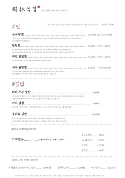 수림식당 메뉴판